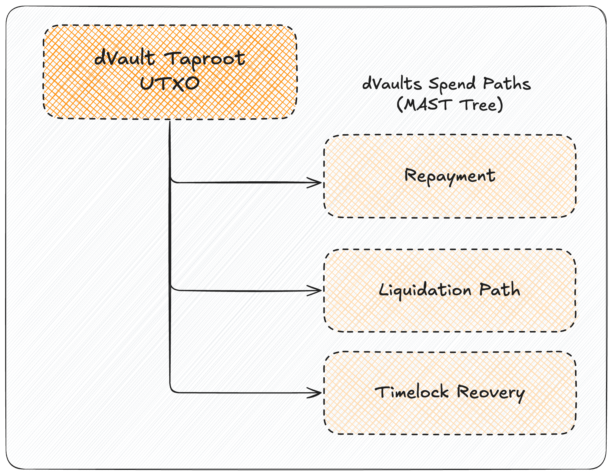 Each dVault locks BTC under a single encoded public key (PT2R) with multiple predefined spend paths: